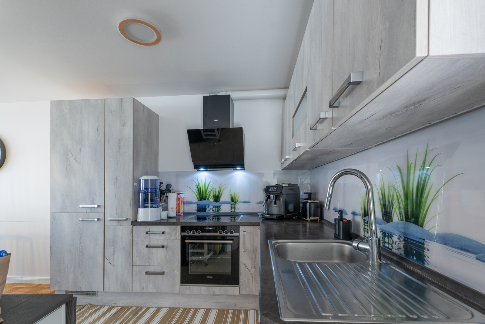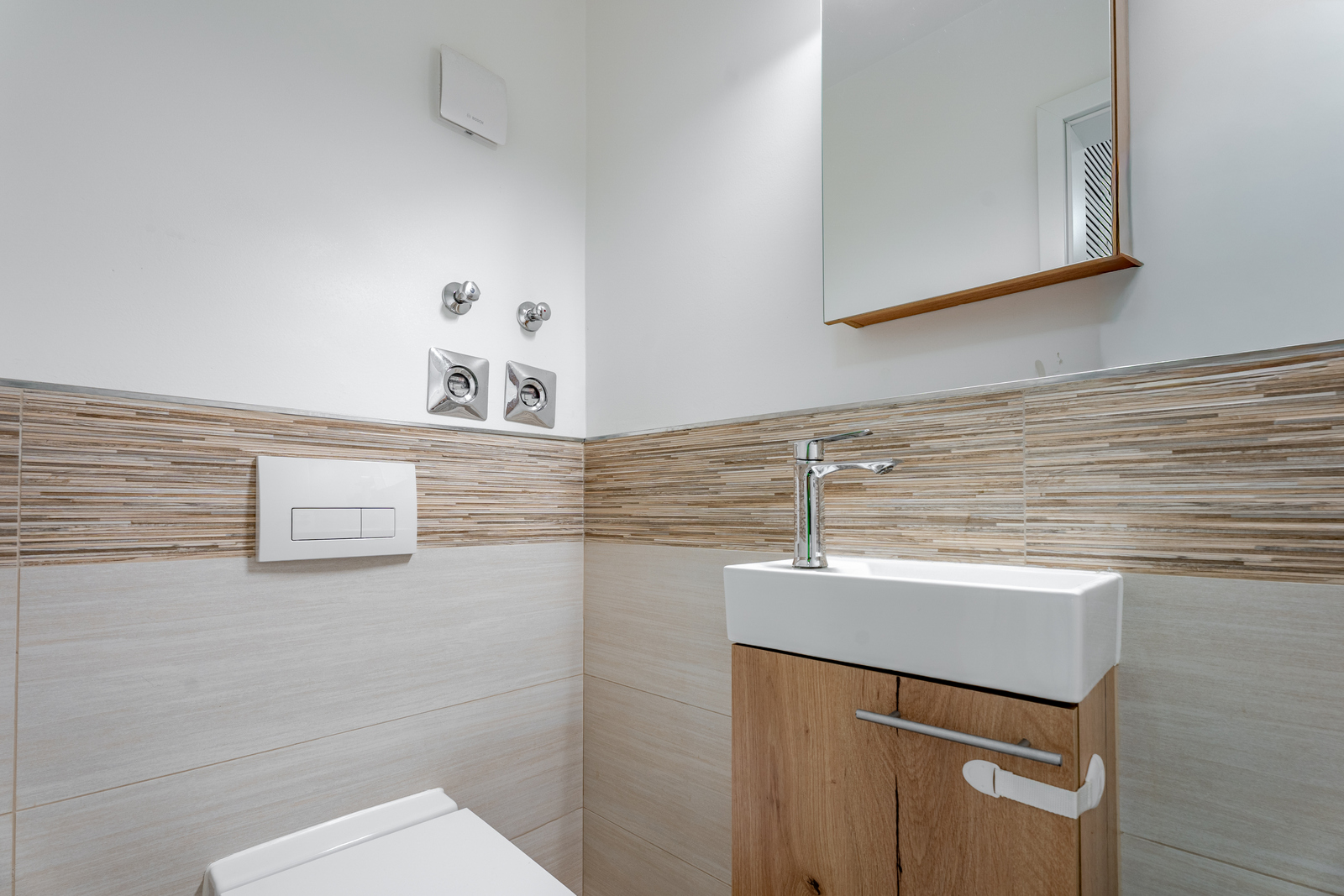 Der großzügige Eingangsbereich bietet praktische Stauraumlösungen und führt in die freundlich gestalteten Wohnräume. Das Kinderzimmer ist optimal geschnitten, während das Elternschlafzimmer mit einem eigenen Balkon punktet – perfekt für den ersten Kaffee am Morgen. Das moderne Badezimmer verfügt über Dusche, Badewanne und hochwertige Armaturen; ein separates Gäste-WC ergänzt den Komfort. Der offen gestaltete Wohn- und Essbereich geht fließend in die Einbauküche über und schafft so ein einladendes Wohngefühl.